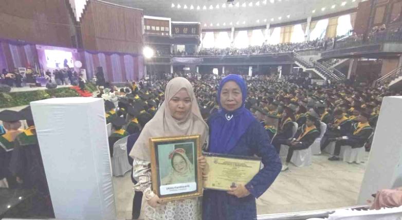 Sebagai gantinya, Noor Dinah (orang tua alm) sambil membawa foto sang anak, tampak berjalan menuju panggung prosesi wisuda mewakili untuk menerima ijazah putri sulungnya dari Rektor Uniska, Abdul Malik.