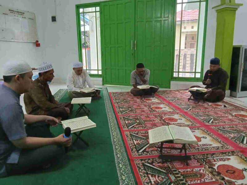 Jemaah Musholla Babussalam Komplek Haji Muhammad Jalan Mahligai melaksanakan khataman Al Qur-an sekaligus buka puasa bersama. Senin (8/4/2024) sore.